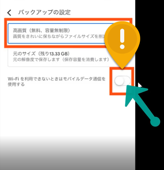 見てわかるように、「高画質(無料、容量無制限)」。そして「Wi-Fiを利用できない時はモバイルデータ通信を使用する」がオフになっています。