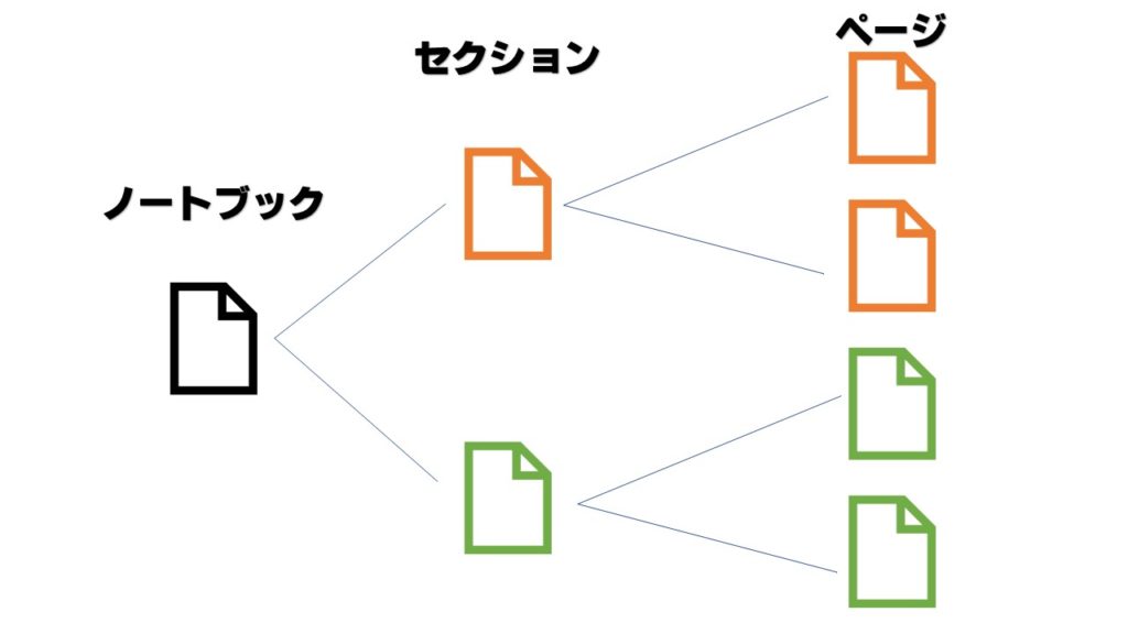 OneNoteの構成は以下の通りです。画面の構成も左からノートブック・セクション・ページとなります。