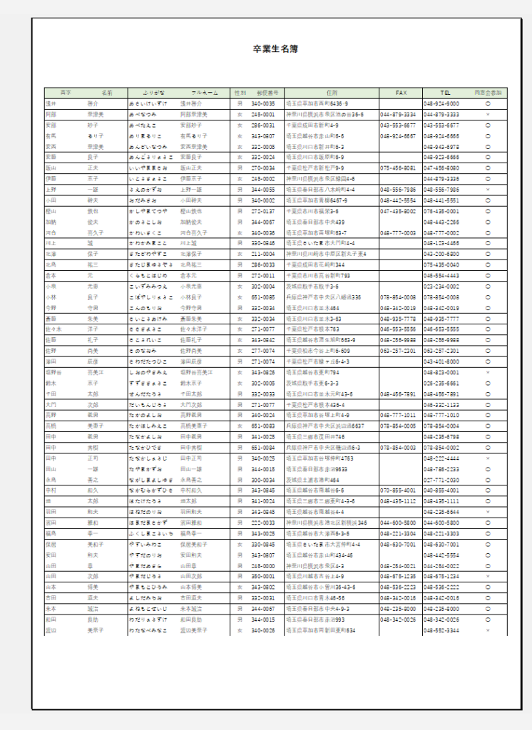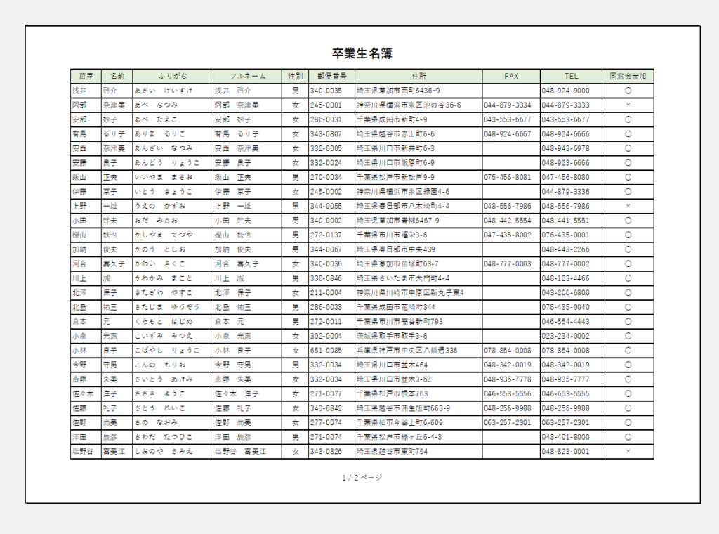 ①列(CとD)には振り仮名とフルネームを入れますが、間にスペース(全角)を挿入してみましょう。