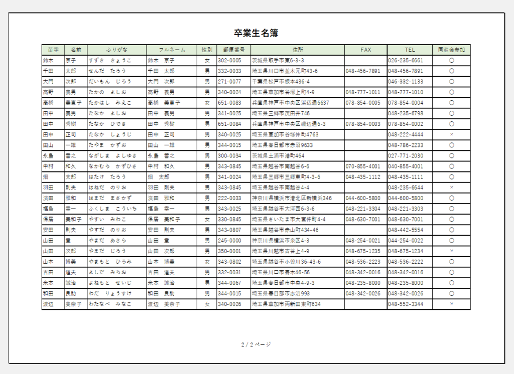 ②ページを2ページに分けます。分けると横長の表になるので、印刷は横向きにしてみましょう。