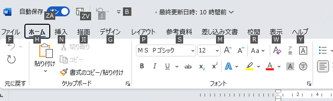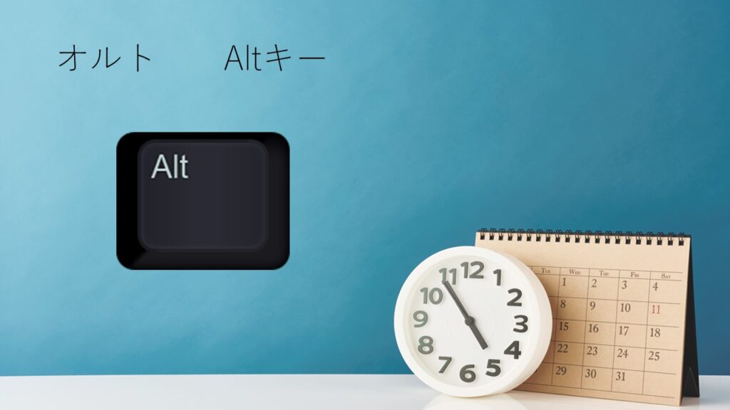 Altは「alternate」で交互・代替などを意味します。マウスの代替と覚えるとわかりやすいと思います。Altキーを押下するとWordなどではリボンに黒い■の中に英字が表示されます。つまりマウスでクリックしながら操作しなくてもその英字を入力していけば操作が出来てしまいます。マウスがあったほうが楽な時はありますが、実はマウスなしでもパソコンは操作できます。その昔はマウスなしパソコンはキーボードのみ操作の時代もありました。