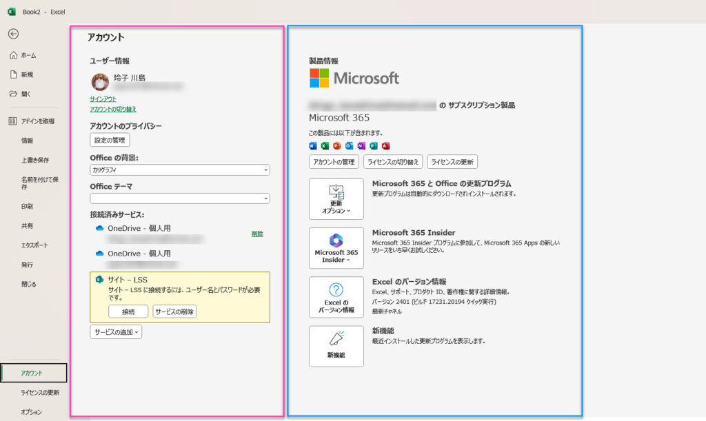 「ファイル」から「「アカウント」をクリックすると、ユーザー情報や製品の情報を知る事ができます。ご自身の情報をぜひご確認ください。