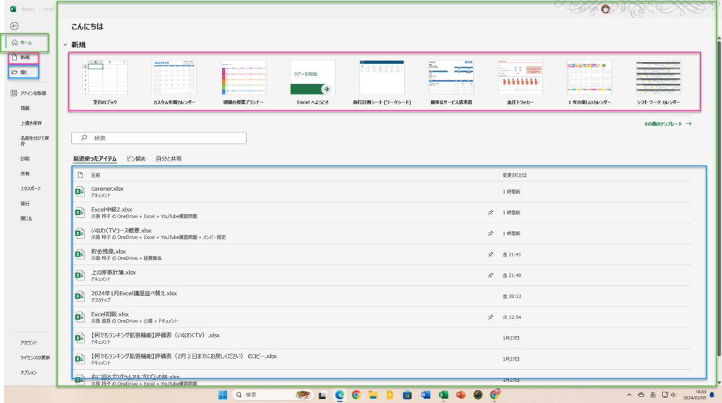 Excel起動したときに、最初の画面を「ホーム画面」と言います。通常はホーム画面が設定されていて、もっと詳細を知りたい時、例えばテンプレートをもっとたくさんの中から選びたい場合やもっとたくさんのファイルから開きたい場合にはそれぞれメニューの下にある「新規」や「開く」から開くようにしましょう。
