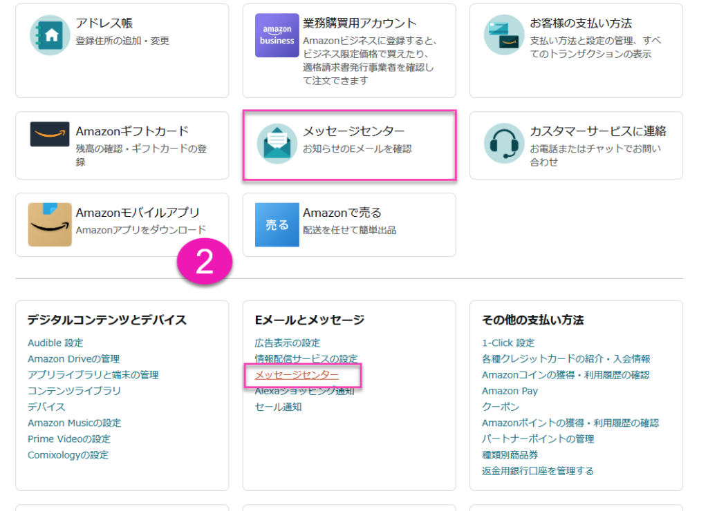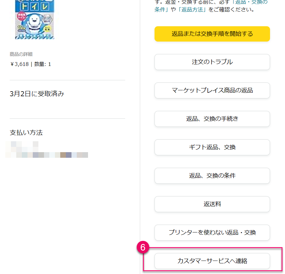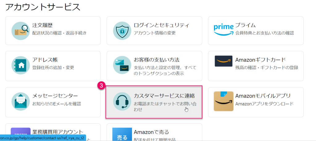 ❸「注文履歴」あるいは、「カスタマーサービスに連絡」をクリック。