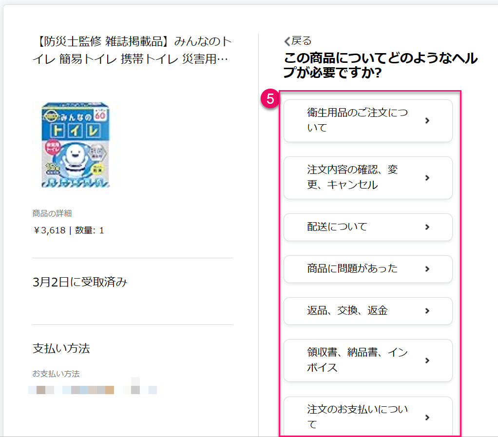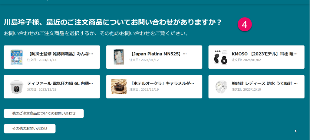 ➍購入した商品に関してであれば商品名を選択して次に進みます。