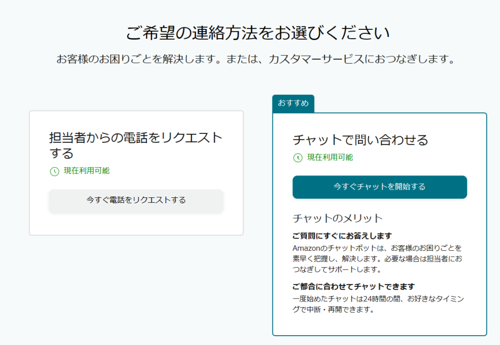 チャットは文字のやり取り、左側は「電話番号を入れるとAmazonから自動で自動音声にて電話の呼び鈴が鳴り、その後センターの人と直接話が出来るようになります。