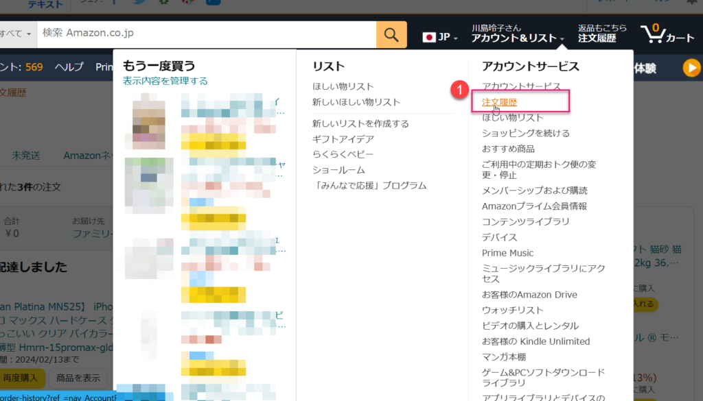 ❶Amazonのトップ画面から右上にある「アカウント&リスト」をポイントし、