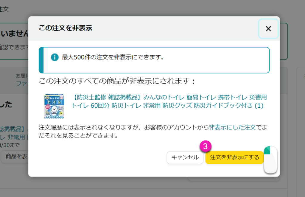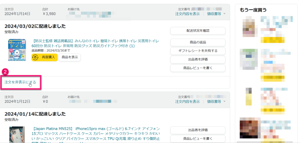 ❷商品履歴の画面から非表示にしたい商品の左上にある「注文を非表示にする」をクリック。