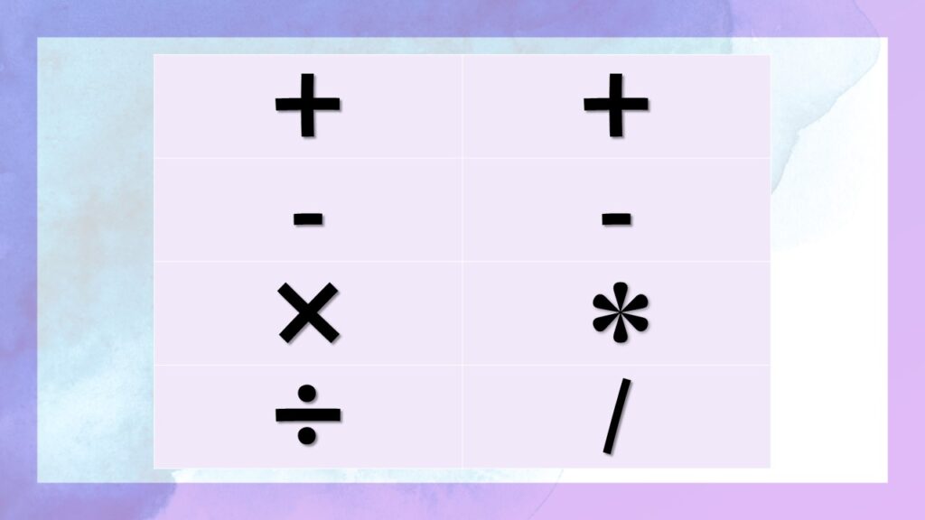 まずは記号からしっかり覚えていきましょう。算数などで使っていた記号とは少々異なります。足す・引くに関しては同じですが、掛けるは「*」アスタリスクを利用します。割るは「/」スラッシュを使います。