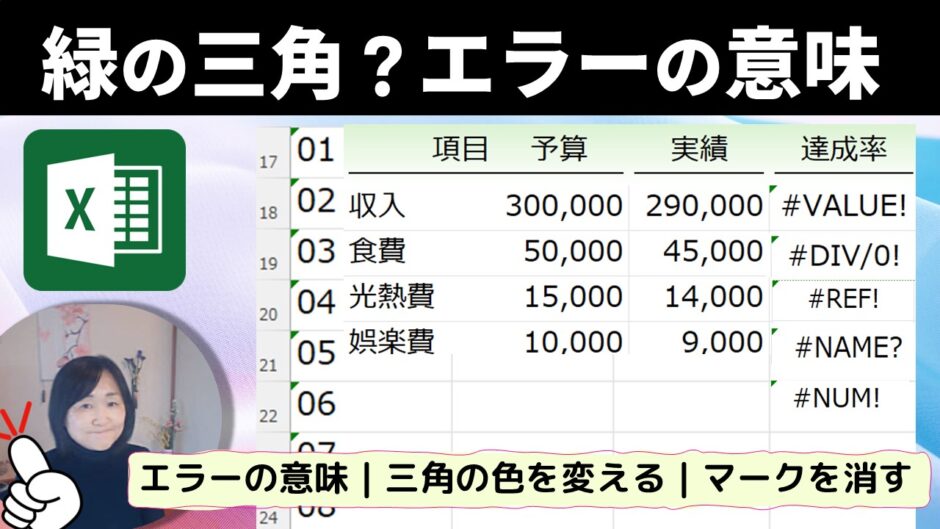 みなさんこんにちは。いなわくTVのかわしまです。Excelを使っていると、セルの左上に緑色の三角形が表示されることがありますよね。これはエラーを知らせるサインですが、見た目が悪くなるので消したいと思う方も多いでしょう。この動画では、緑の三角形が表示される原因と簡単に消す方法を初心者向けにわかりやすく説明します。Excelにはいろいろなエラーメッセージがあります。意味を解説し対処法も覚えていきましょう。ぜひ最後までご覧ください!
