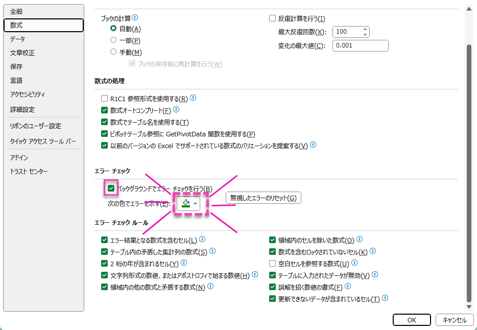 Excelのオプションでエラーチェックの色を変更する。