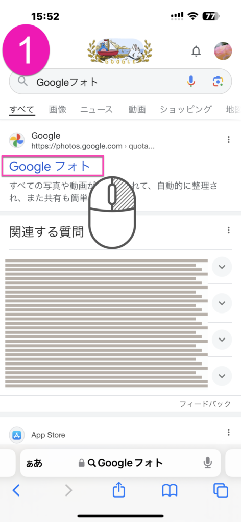 ❶safariで「Googleフォト」と検索する。検索結果の「Googleフォト」の文字の上で長押し。