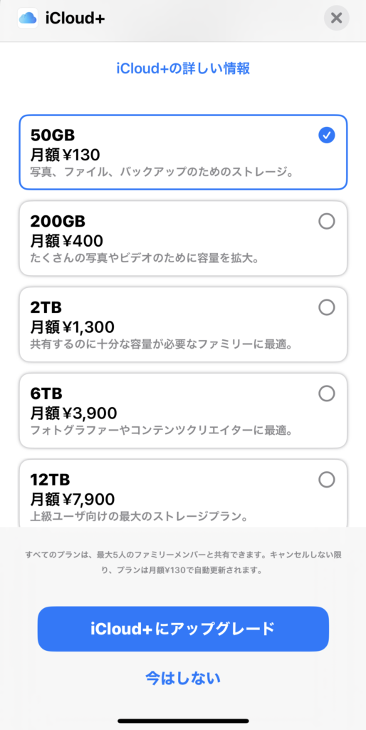 5ギガ以上は有料になります。容量を増やすには以下の料金がかかります。大したことないかな?便利に使っていこうと思われた方!ちょっと待ってください。よく考えて追加してくださいね。便利だけど、毎月かかりますし増えた分だけまた増やしていく傾向ってありませんか?料金的には賄えるからと安易には個人的にはおススメしません。
