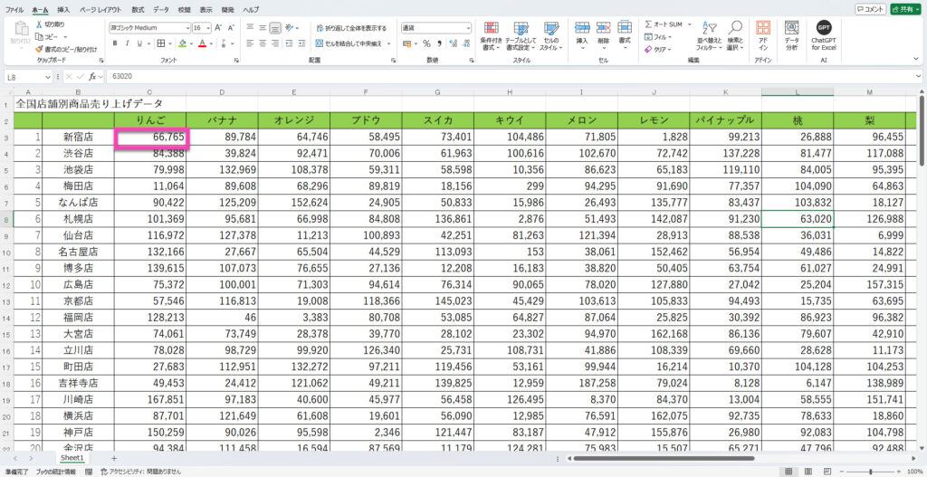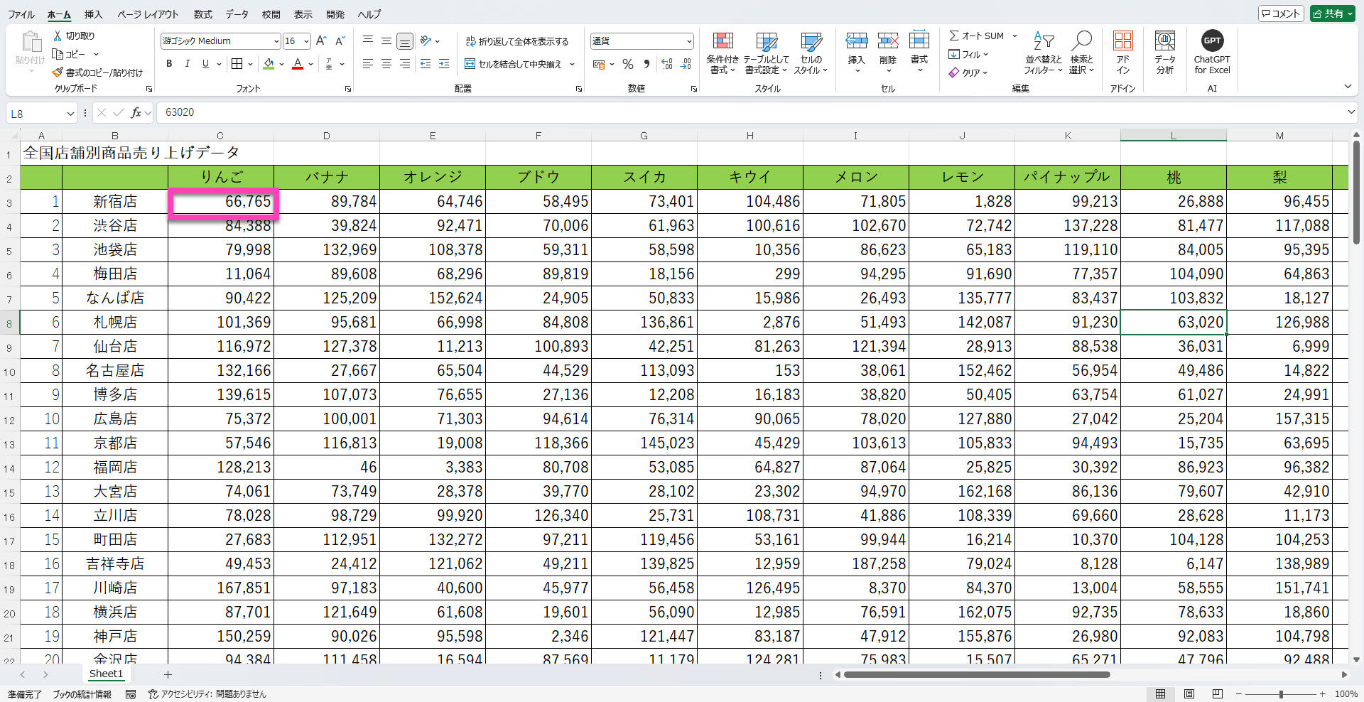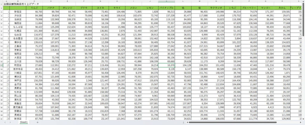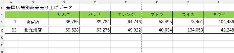 大きな表で、行と列の両方を固定したい場合もあります。例えば、果物の名前や店舗名が常に表示されるようにしたい場合、以下の手順で行と列の固定が可能です。