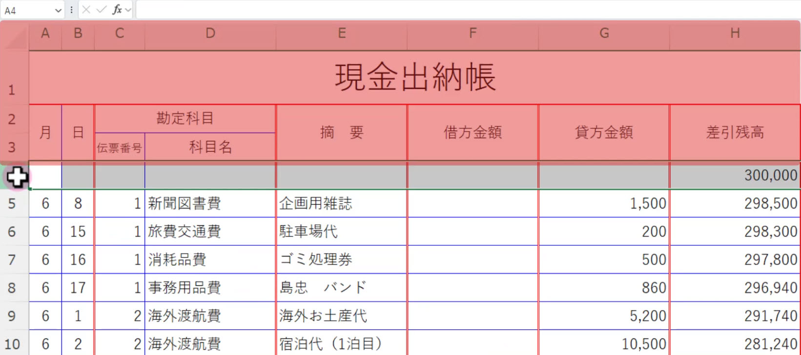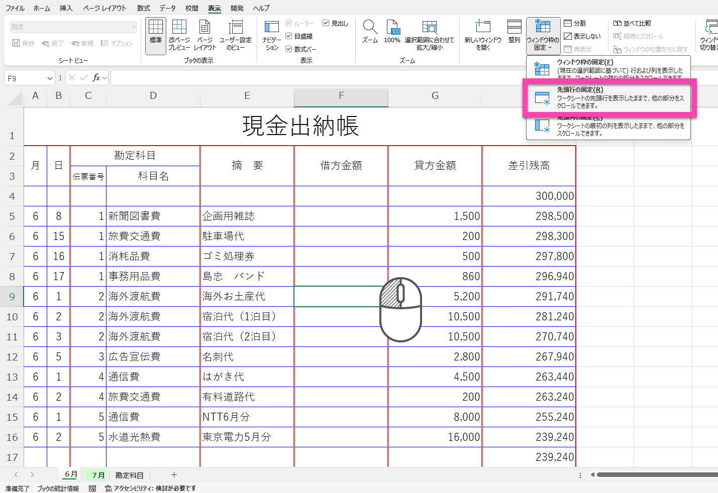 1行目を固定したい場合には、表を選択し(表内のどこでも構わない)「先頭行の固定(B)」をクリックしましょう。下の表であれば、「現金出納帳」の1行目がいつも固定されるようになります。