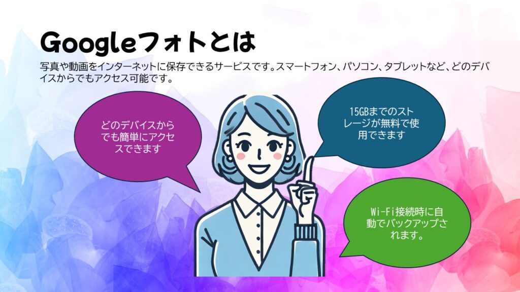 今回のブログでは、Googleフォトを活用してパソコンの写真をスマートフォンで簡単に閲覧する方法を紹介しました。Googleフォトは、写真や動画を効率よく管理できる便利なツールです。ぜひ、この機会にGoogleフォトを活用し、デバイス間で写真の連携をスムーズにしてみてください。