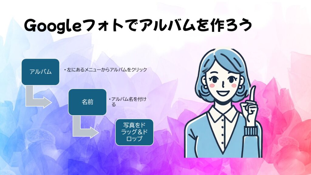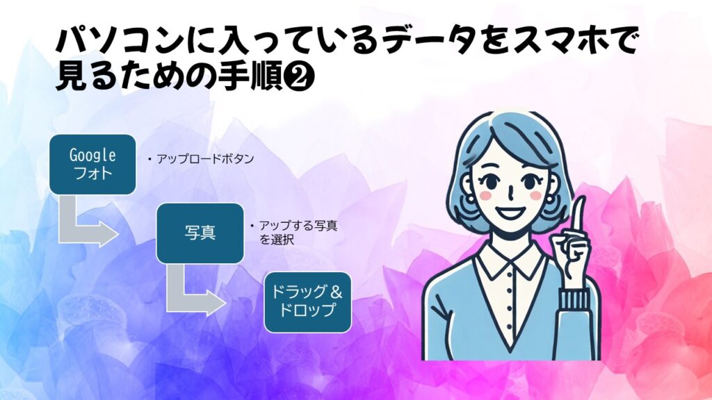 ここからは、パソコンに保存してある写真をGoogleフォトにアップロードし、スマートフォンで閲覧するための具体的な手順を説明します。
