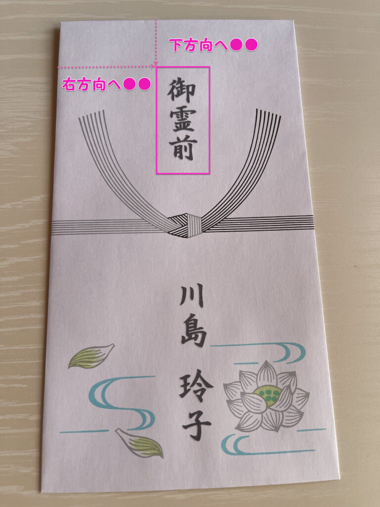 ここまでは、Wordのテンプレートを利用して図形を描いたものに印刷して装飾し完成したものになります。ですが、市販の封筒には「ご霊前・ご仏前」などのようにすでに印刷されたものが販売されています。下に自分の名を入れます。ところが、実際にはご霊前の場合薄墨が良いとされていたりと筆がないなんていうこともあります。筆不精な人にも、毛筆で書くのには抵抗のある人も多いのが昨今の現状ではないでしょうか。このご時世ですので、プリンターがあれば印刷して綺麗な字にしたいという方は多くなりました。その時に、ちゃんと自分の名前を指定した場所に印字したいということが起きます。