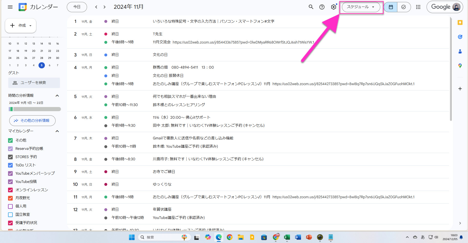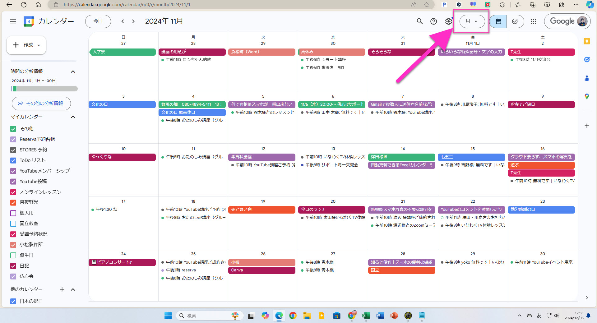 カレンダー表示でも直感的に色で分かりますし、左部分のチェックを入れたり外したりすることで見やすくなります。予定が増えたりしてもこれで問題なし!