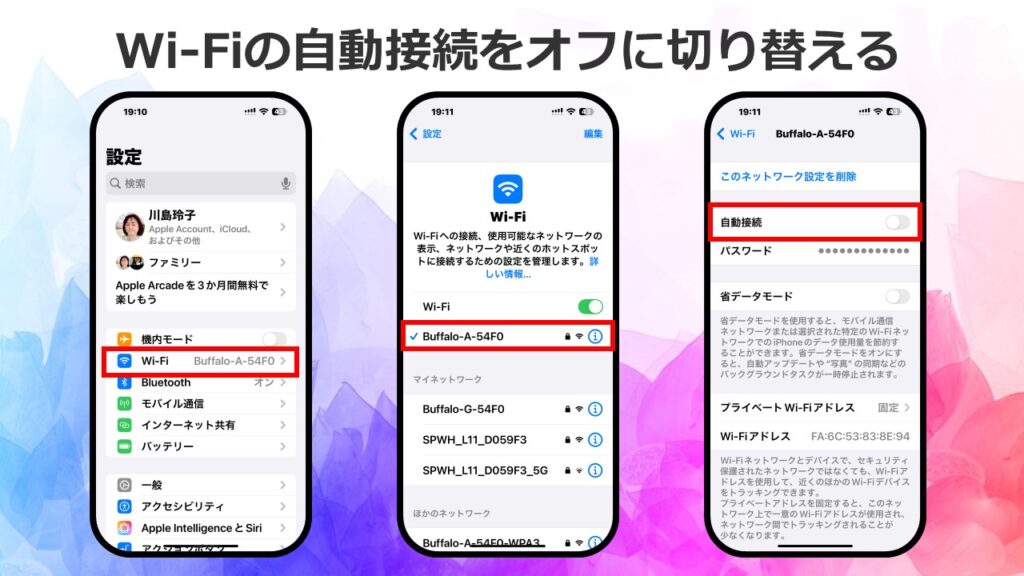 一度繋いだないだWi-Fiに自動で再接続される設定です。これを自動で接続しないように設定します。