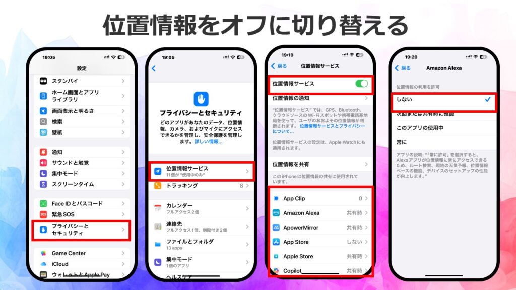 - 「位置情報サービス」をオフ、もしくは各アプリごとに設定変更