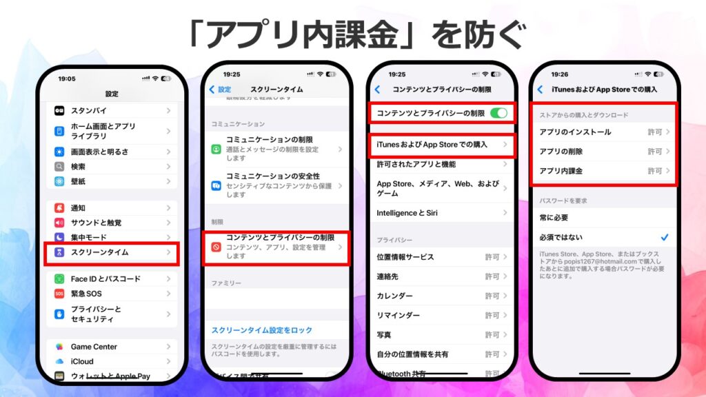 特に「アプリ内課金」はうっかりミスが多いので、最初に制限をかけておくと安心です。
