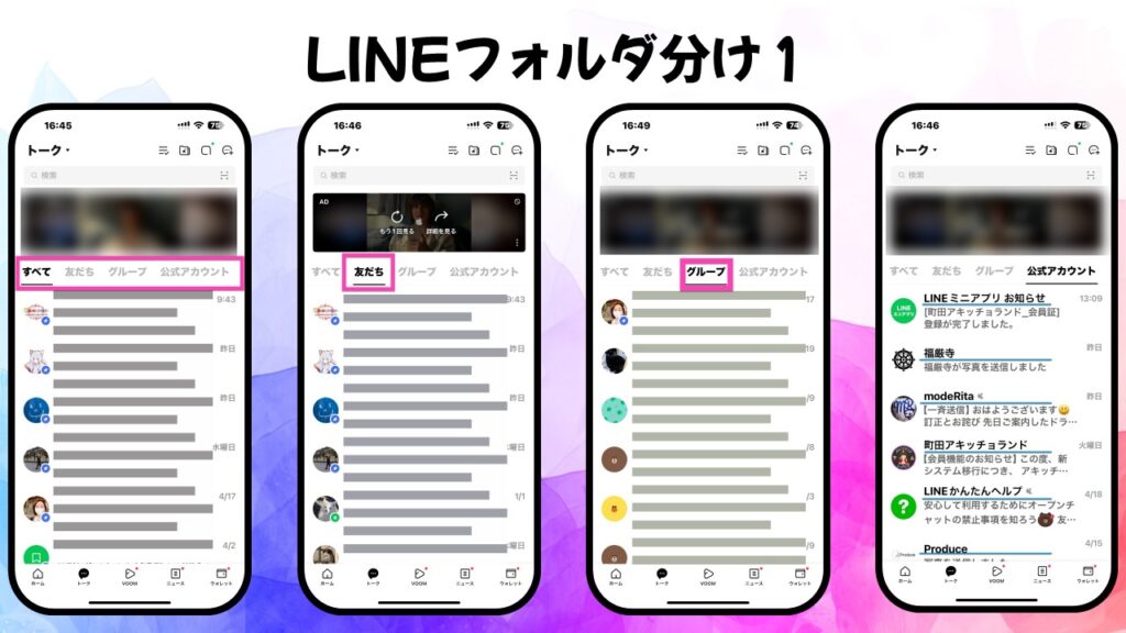 でも安心してください。ちょっとした設定をするだけで、「友達」「グループ」「公式アカウント」ごとにタブで分けて表示できるようになります!