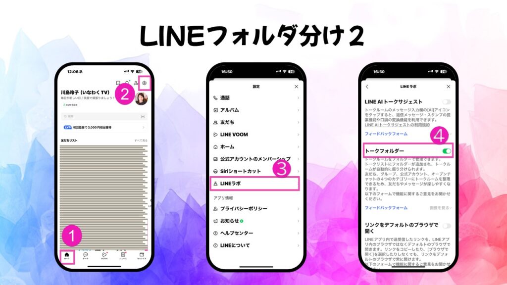 - 「トークフォルダー」をオンにすると友達・グループ・公式アカウントにタブで分かれる