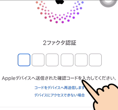 • パスワード入力後、2ファクタ認証コードの入力画面が表示される。デバイスが手元にないため、コードは受け取れない。