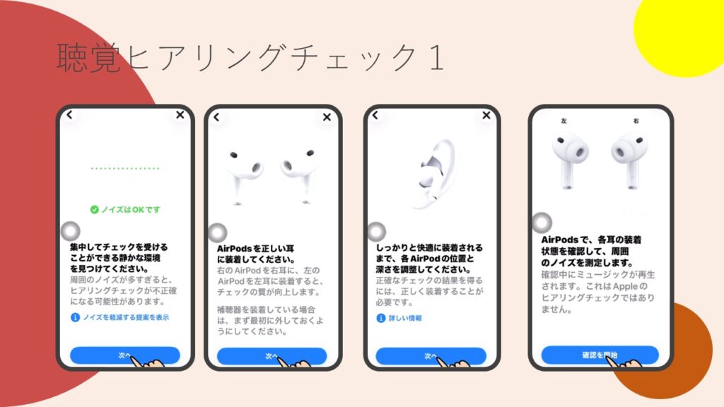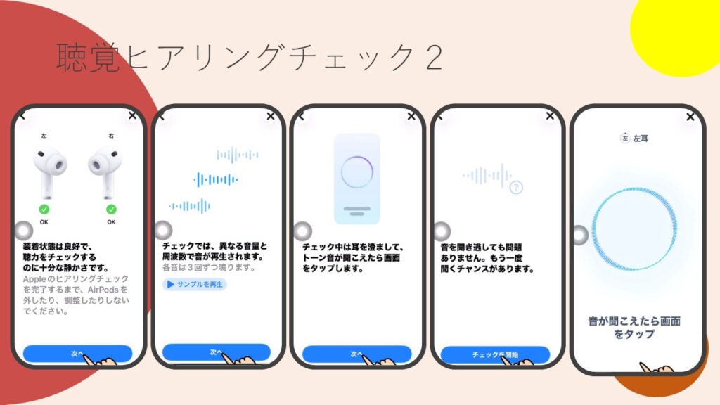 まずは補助機能を使う場合、ヒアリングチェックをしましょう。左→右へとそれぞれテストをします。音が鳴ったのを確認したらスマホの画面をタップします。よくテストする際に鳴る高音や低温の音がだんだん大きくなるあのテストです💦