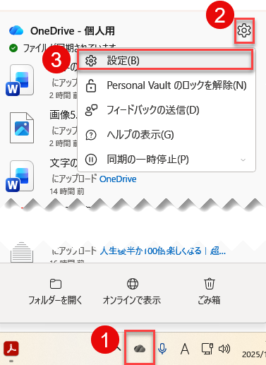上記の順で、OneDriveの設定を開けます。