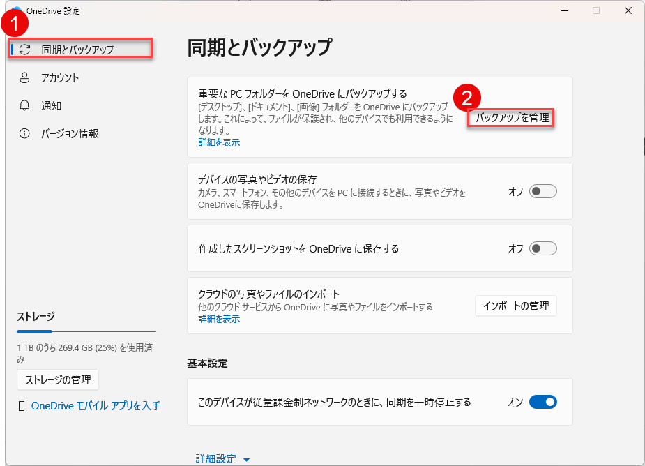 バックアップと同期「バックアップを管理」をクリックします。