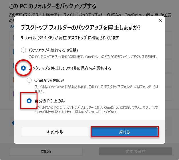 ※ちなみに同期を停止し、パソコンではなくOneDriveのみアップしておきたい場合は上のチェックである「OneDrive内のみ」にチェックを入れましょう。こうすることで、パソコンからはこれまで表示していたフォルダやファイルは見えなくなりOneDriveのみに置かれた状態になります。自分のパソコンはスッキリして見えることでしょうし、容量も減ります。