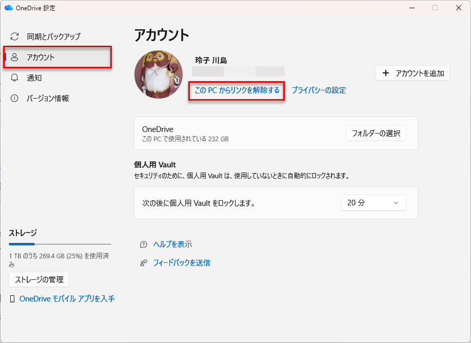 - 「設定」→「アカウント」→「このPCのリンクを解除」