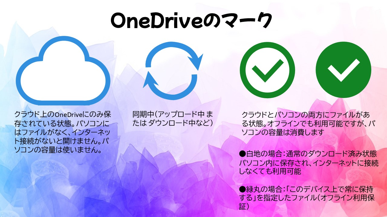 OneDriveと同期するとファイルやフォルダのアイコンに小さなマークが表示されます。この意味をサクッと覚えておきましょう。
