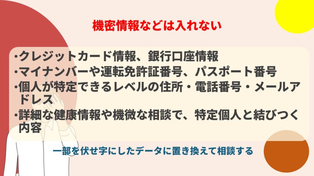 個人情報になるものは聞かないようにしましょう。またセンシティブな内容も。口座情報なども具体的には入れないようにします。ただ、比喩的に「40代の女性が」というような表現に変えるとよいでしょう。