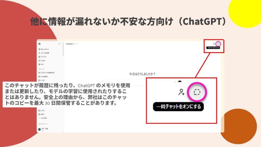 ChatGPTの画面の右上にある吹き出しから「シークレットモード」を利用します。