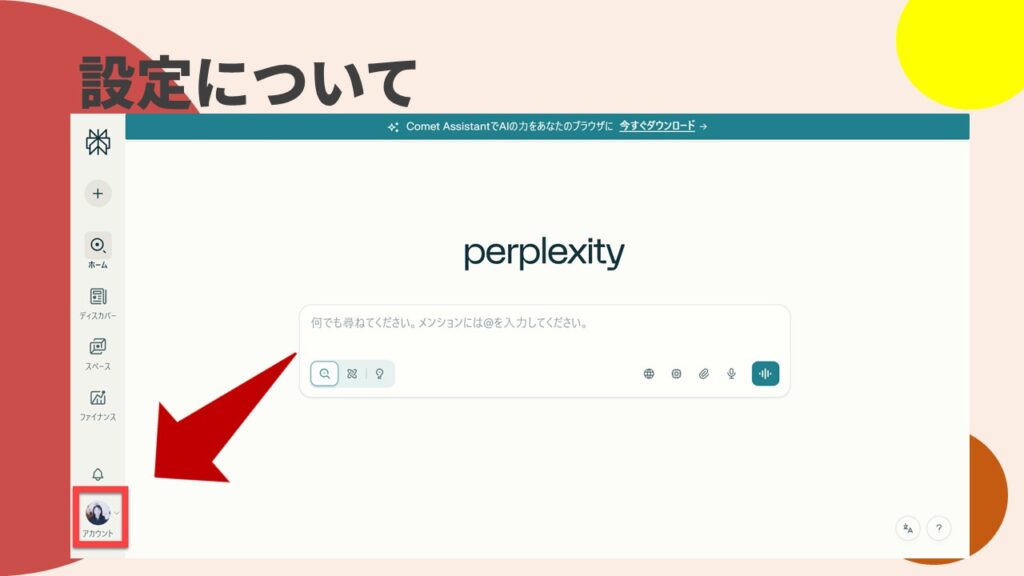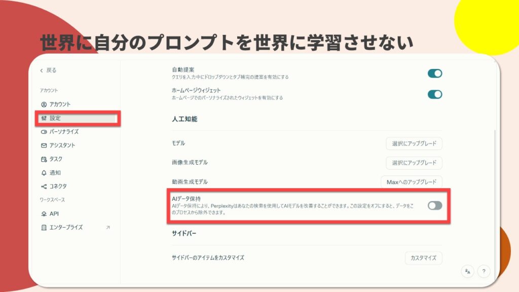 今回はPerplexityで設定変更の方法をお伝えします。もちろんChatGPTなども同じ要素の項目が用意されています。
