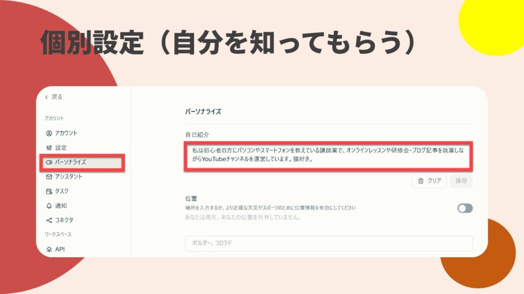 なぜ「設定」が重要なのか?それは やり取りが「あなた専用」に最適化されるからです。親しい友人と話す時、以前話した内容を覚えてくれていると嬉しく感じませんか?初対面の人よりあなたのことを普段から知っている人なら前提を話さなくても会話がスムーズですよね。 「そういえば、この前のあの件、どうなった?」と聞かれると、「あれはね・・・」と主語がなくても理解してもらえますよね。ChatGPTのようなAIも、あなたのことを「記憶」する力を持っています。 でも、外部に学習されたりして使ってはほしくないということもあります。家族だって、他人に名前など出さなかったとしても触れて欲しくないってこともあります。 設定でいくらでもそれはできるのです。この動画ではそのあたりの事前設定について詳しく初心者向けに解説しています。