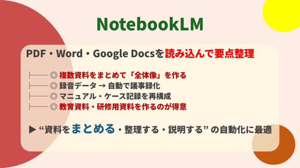 ▶ “資料をまとめる・整理する・説明する” の自動化に最適