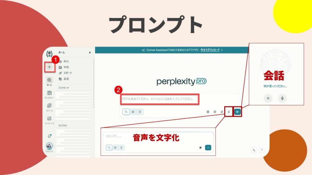質問すること、あるいは命令指示をすることをAIでは「プロンプト」と呼びます。このプロンプトは文字だけでなく、声やファイルなどを挿入してそれについての質問などをすることができます。リアルタイムで会話しながらといったこともできます。