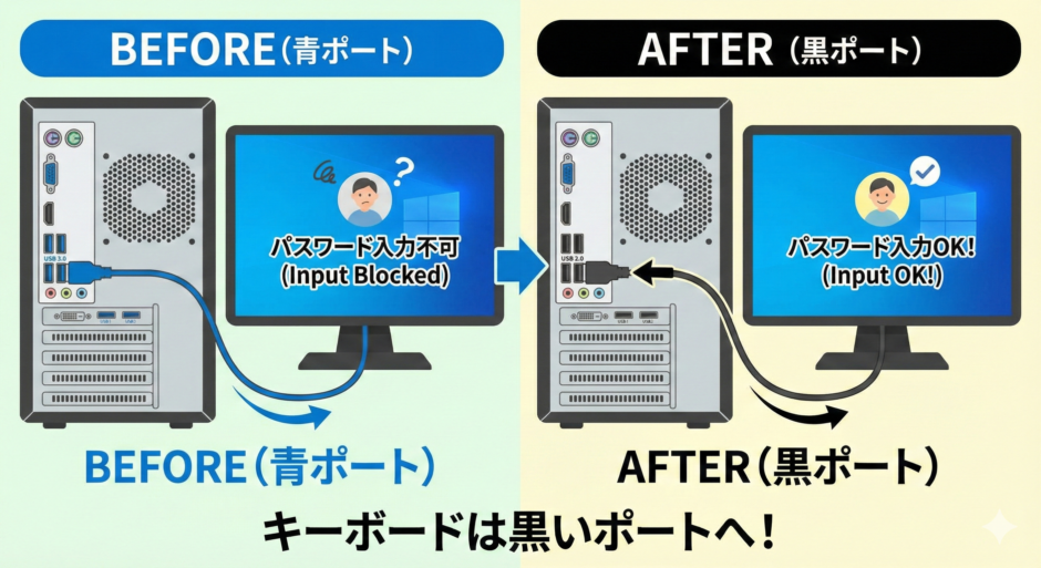 結論から言うと、キーボードをPC背面の「青いUSBポート」から「黒いUSBポート」に挿し替えるだけで解決しました。