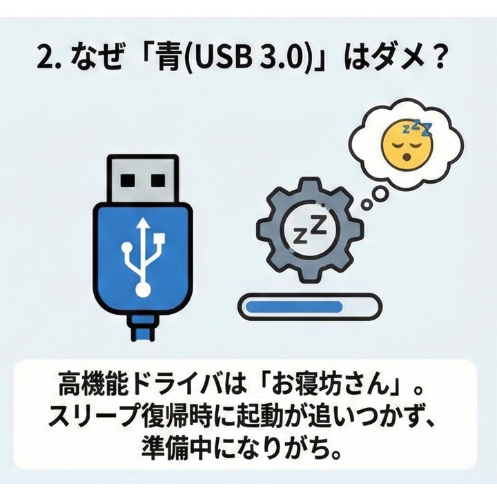 ▼「お寝坊さん」な高機能ドライバ青いポート(USB 3.0以上)は、高速通信のために複雑な「ドライバ」を使って動いています。スリープから目覚めた時、Windowsのログイン画面が出るスピードにドライバの起動が追いつかず、キーボードが「まだ準備中…」のまま取り残されてしまうことがあるのです。