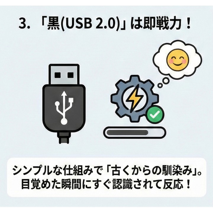 ▼「即戦力」な黒いポート対して黒いポート(USB 2.0)は、PCにとって「古くからの馴染みの存在」。特別な準備なしで、目覚めた瞬間にすぐ認識される仕組みになっています。そのため、スリープ復帰直後のログイン画面でも即座に反応してくれます。