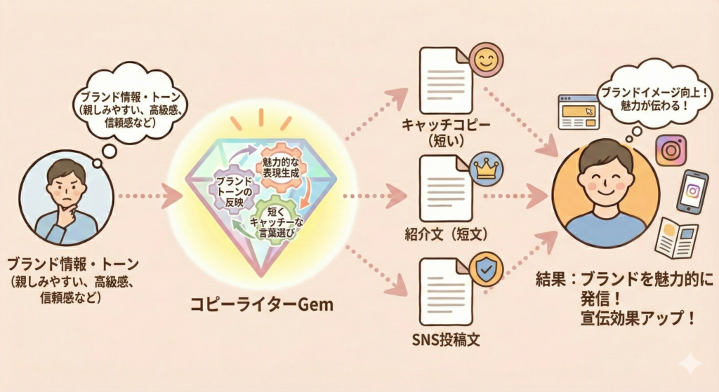 - できること:ブランドのトーン(親しみやすい・高級感・信頼感など)を反映した短いキャッチコピーや紹介文を生成します。