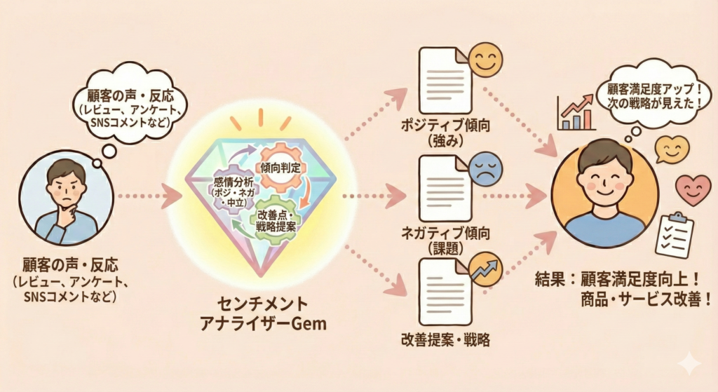- できること:レビューやアンケート、SNSコメントなどから「ポジティブ・ネガティブ・ニュートラル」の傾向を判定し、改善点や次の戦略を提案します。