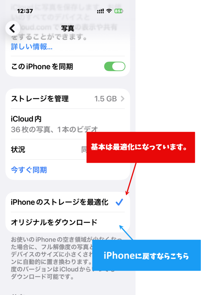 以前のように「読み込み中」と表示されなくなっていれば、写真はiPhone本体に戻っています。