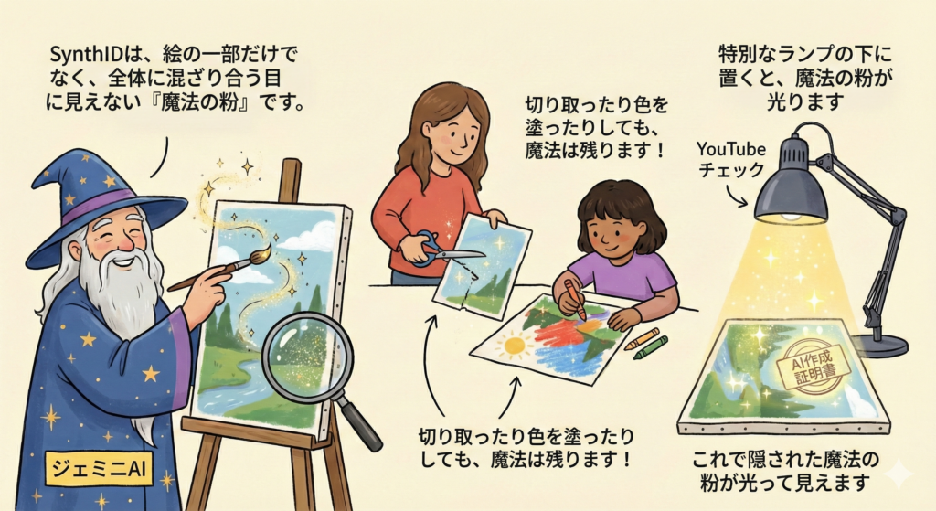 - SynthIDとは?: ピクセル単位で刻まれた「見えない魔法の粉」のようなものです。