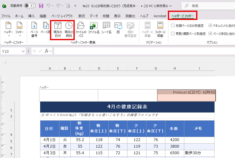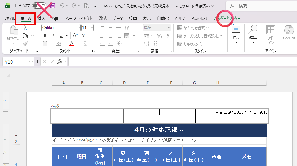 シートの中に情報を詰め込まず、ヘッダー・フッターのエリアを賢く使うと、印刷した資料がぐっとプロらしく仕上がります。ビジネス文書はもちろん、家計簿や健康記録表など、ご自身で使う資料にもぜひ試してみてください。