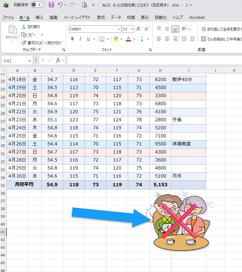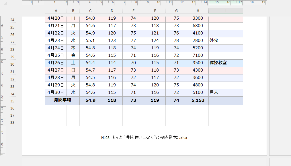 シートを開くと、1か月分の体重データが入っています。このデータは複数ページにまたがります。
